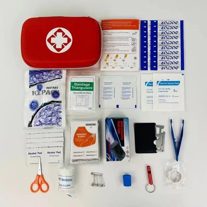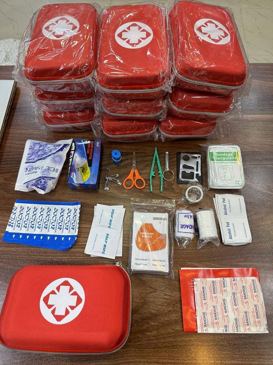 محتویات داخل جعبه چسب زخم، پنس، گاز استریل، باند کشی، باند زخم، پد الکلی، سوت، سنجاق قفلی، پتوی نجات، قیچی، چسب حلقه ای، چراغ قوه که بدون‌باتری کار میکند