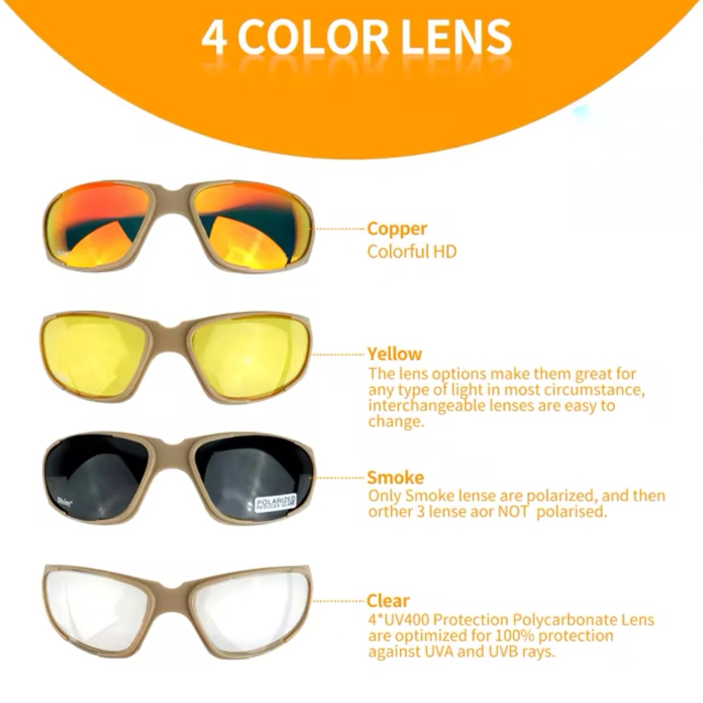 یکی از نقاط قوت اصلی عینک تاکتیکال C9 دایزی 2024 NEW، وجود ۴ لنز جداگانه است که امکان تطبیق با شرایط نوری گوناگون را فراهم میآورد. بهعنوان مثال: