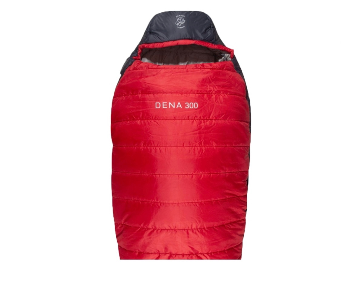 طراحی ظاهری این کیسه خواب انیسه الیاف دنا 300 سایز لارج در تصویر مشخص است: بدنه قرمز با برند دنا 300 بر روی آن و قسمت سرمشکی که محافظ سر و گردن را تکمیل می‌کند.